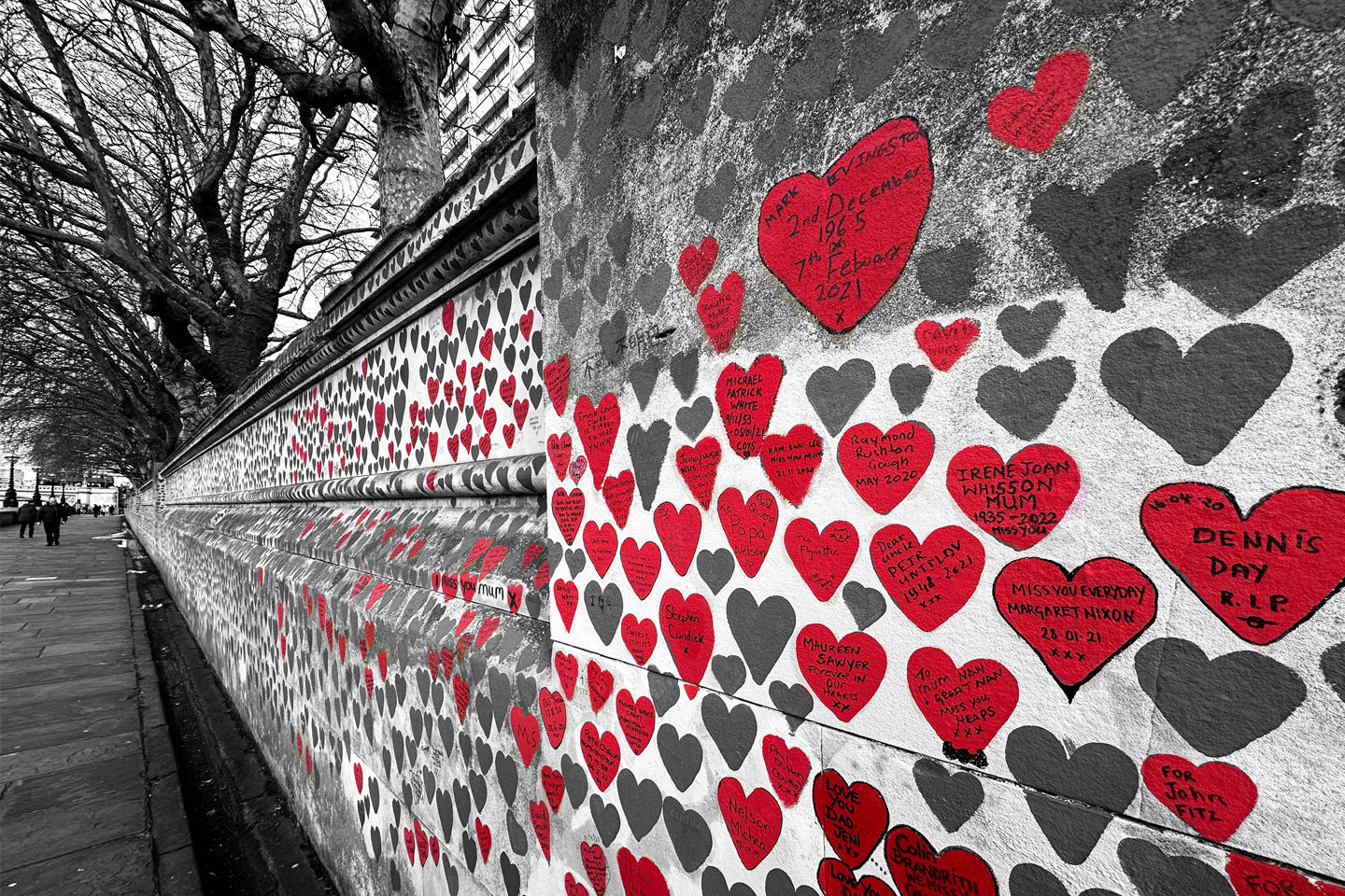 Honorable Mention: The Queen of Hearts / London, UK by Lucas San Miguel, Emory College of Arts and Sciences. – An unofficial UK COVID-19 memorial wall along the Thames River. The wall is painted with 236,245 red hearts, each representing a life whose death certificate’s cause of death was COVID-19. This is intended to juxtapose that some who died due to COVID-19 were remembered by their loved ones who came and wrote in the hearts, but many thousands of lost lives remain unrecognized. The image underscores the importance of public health accountability and preparedness.